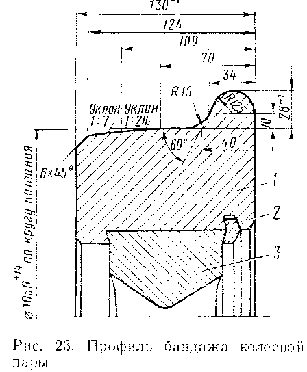 Величина конусности рабочей части по кругу катания бандажа небольшая— 1:20. Наружные части бандажей имеют конусность 1:7. Эта часть поверхности бандажа мало изнашивается, так как касается рельса только при движении в кривых очень малого радиуса. Кроме того, конусность 1:7 облегчает проход стрелочных переводов. Профиль бандажа способствует более равномерному износу поверхности катания. Фаска 6X45° у наружного торца бандажа или обода колеса служит для восприятия наплывов металла, образующихся на по-