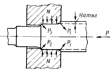 Во время формирования усилие запрессовки р (рис. 24) преодолевает усилия р\ и р2 деформации материала оси и силу трения, равную силе /V давления на