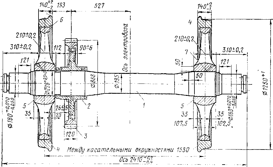 венец колеса 3 соединяется со втулкой при помощи призонных болтов. Расстояние между внутренними гранями бандажей колесной пары электровоза ЧС4, как локомотива с конструкционной скоростью более 140 км/ч, должно быть в пределах 14401? мм. Проверку сохранности установленного допуска производят на выкаченной колесной паре.