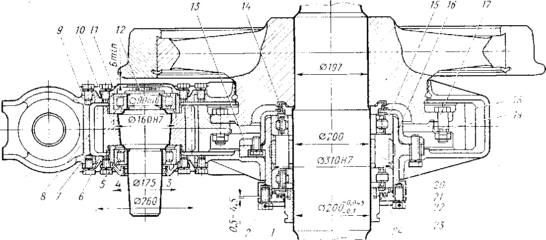 I - кольцо упорное. - кольцо уплотнительное; ,5 —упорное кольцо подшипника шестерни; 4- крышка передняя; .5 - подшипник 80-32518 ЛІ 6 — большая крышка переднего подшипника, 7 — корпус редуктора, » — шестерня; 9 — большая крышка заднего подшипника' 10 - крышка задняя; //-подшипник 80-92518 ЛІ; 12 - шайба, 13- крышка упорная. 14 - кольцо лабиринтное, 15 - подшипник 80-32140 Л-!; 16 -стакан опорный, 17- болт прнзонный. /Я -венец зубчатый /Ч- шайба стопорная; 20 — наружное распорное полукольцо; 21 — внущеннее распорное кольцо; 22 - подшипник 80-92140 .43, .3 крышка лабиринтная, 24 -- мэелоотбойное кольцо