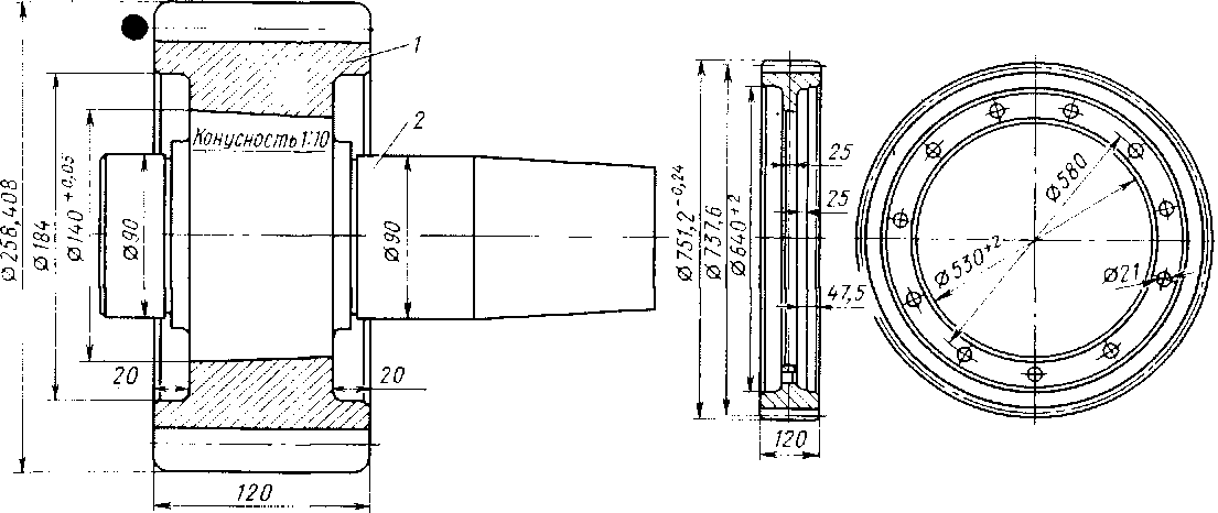 После термообработки рабочие поверхности зубьев, впадины и конусное отверстие шлифуют. Вал 2 изготовляют из стали Ст5 или стали 45. Посадочные поверхности (конуса для посадки венца, хвостовика для посадки фланца и шейки под роликовые подшипники) шлифуют. Перед посадкой венца на конус вала сопрягаемые поверхности притирают и обработанный венец нагревают в масляной ванне до 190—200 °С. После посадки в горячем состоянии зубчатый венец должен сесть глубже на 1,25—1,75 мм, чем при пробной посадке в холодном состоянии.