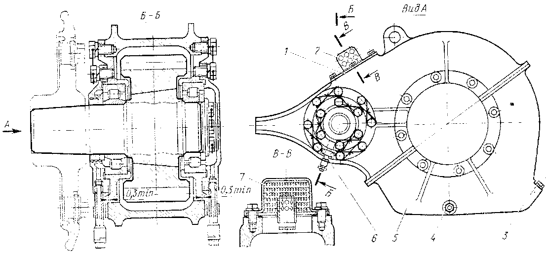 Задний подшипник // через упорное кольцо закреплен шайбой 12 и четырьмя болтами, завернутыми в торец вала. Крепительные, переднюю и заднюю крышки крепят болтами с пружинными шайбами. Для предотвращения самоотворачивания головки болтов попарно связывают проволокой. Подшипниковые узлы за-