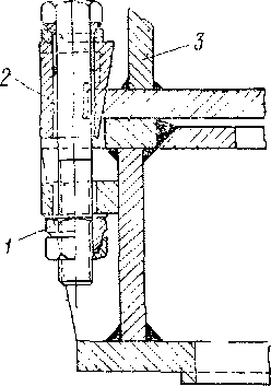 На нескольких электровозах ЧС4 проходили эксплуатационную проверку буксы с резиновыми торцовыми упорами (рис. 32). Аксиальное усилие на передний подшипник передается последовательно через прижимную плиту 4, закрепленную фасонными болтами 5 к торцу оси, резиновый корпус 3, опорную плиту 2 и фасонное упорное кольцо 1. Назначение резинового конуса — равномерное