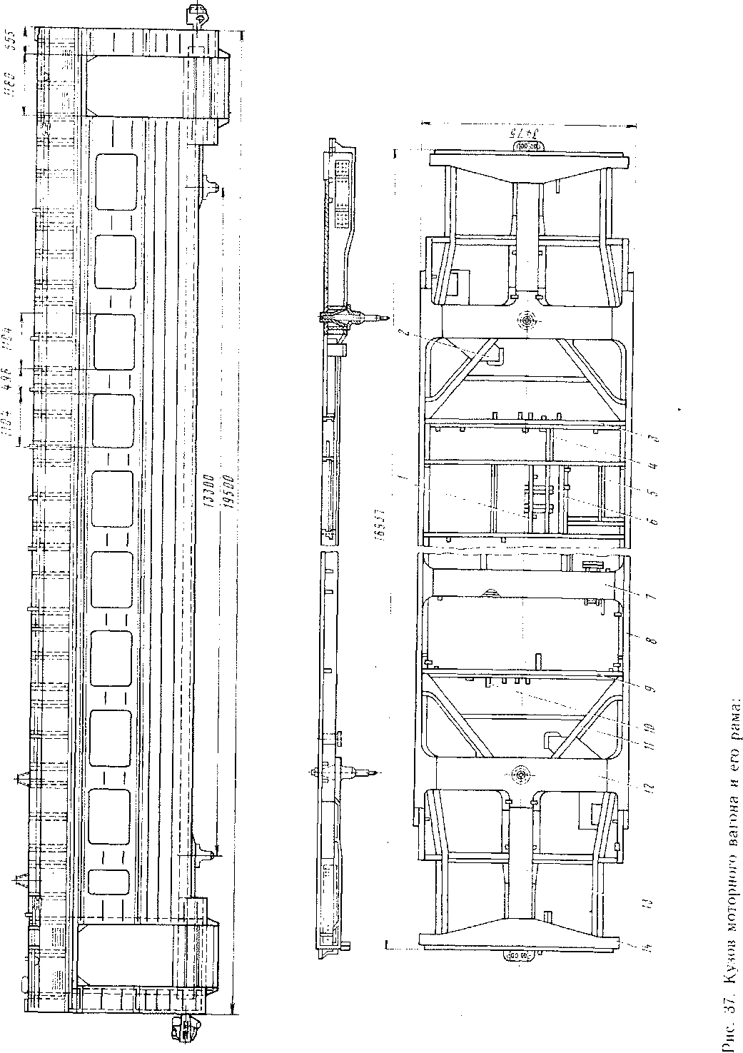 Вагоны электропоездов ЭР9М и ЭР9Е выполняют с металлическими кузовами. Кузова вагонов — несущей конструкции, в которых рама, боковые стенки и крыша работают как одно общее сечение и одновременно воспринимают действующие на вагон нагрузки. Кузова вагонов (рис. 37, а) состоят из рамы, боковых и торцовых стен и крыши. Рамы моторного и прицепного вагонов одинаковы по своей конструкции и отличаются лишь вспомогательными элементами — балками и кронштейнами для подвески электрического и пневматического оборудования.