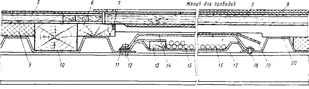 / — линолеум; 2 — крышка смотрового люка; 3 — раму смотрового люка. 4 — уплотнительная резина; ,5 — плита столярная; 6— рама люка; 7— уплотнитель; 8 •— линолеум (дорожка); 9 — изоляция; 10 — пролольный брус; // — резиновая полоса (уплотнитель); 12 — болт крепления съемных крышек; 13 — деревянный брусок (ограничитель); 14 —крышка желоба съемная; 15 — электропровода; 16 - крышка желоба несъемная; 17 — продольный желоб; 1Н — заклепка для крепления несъемных крышек; 19 — асбест толщиной 4 мм; 20 — гофрированный лист; 21 — поперечная балка рамы