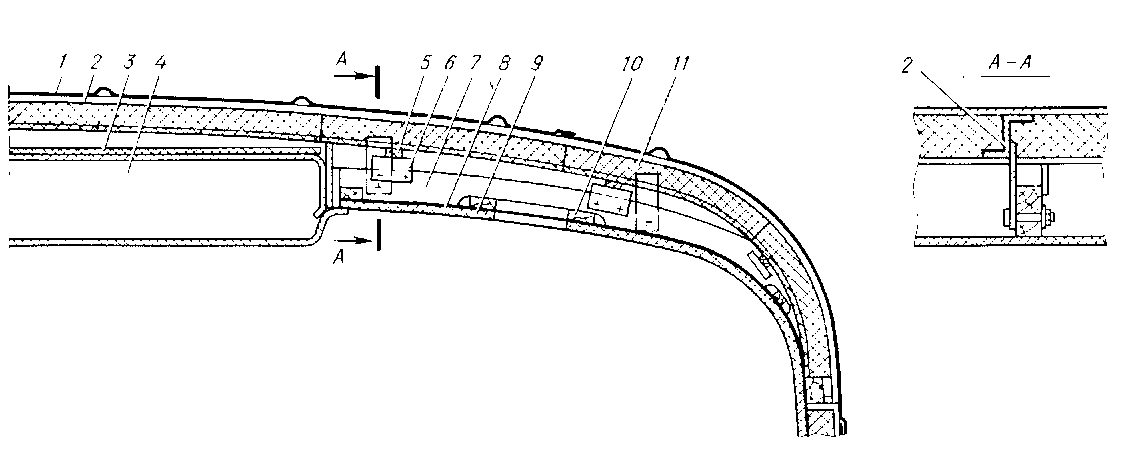 Конструкция потолка (рис. 39) аналогична конструкции боковых стен. Она состоит из деревянных дуг, продольных брусков и реек. Деревянный каркас крепят болтами к металлическим дугам крыши. Внутреннее пространство каркаса заполнено термоизоляционными пакетами, под которые кладут полиамидную пленку. Каркас обшит сверхтвердыми древесноволокнистыми плитами толщиной 3,2 и 4 мм и окрашен в белый цвет. В средней части потолка пассажирского помещения в нише шириной 1230 мм расположен вентиляционный канал. По обе стороны от центрального вентиляционного канала в два ряда по центру диванов расположены два желоба для размещения светильников. В тамбурах над потолком устроены чердаки, по концам которых расположены вентиляционные агрегаты, для обслуживания которых предусмотрены два больших люка. Обшивку торцовых стен кузова прикрепляют к деревянным брускам, которые прикреплены