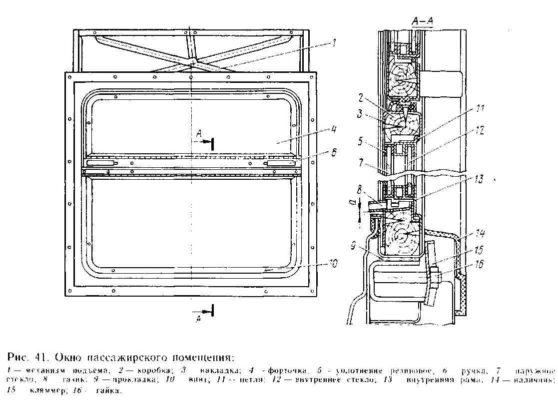 Деревянный каркас окна армирован алюминиевыми профилями. Наличники окон изготовлены из стеклопластика. Между рамой окна и кромкой оконного проема установлена уплотнительная прокладка 9. Окна пассажирских помещений имеют подъемные форточки 4, которые фиксируются в закрытом и полностью открытом положениях с помощью стержней, расположенных в ручках 6. Для облегчения подъема форточки широких окон имеют самоуравновешивающийся механизм подъема /.