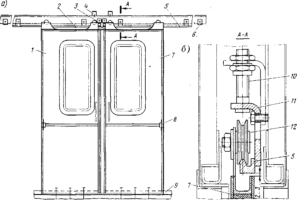 Рис. 42. Раздвижные двери пассажирского помещения (а) и узел их подвешивания (б):