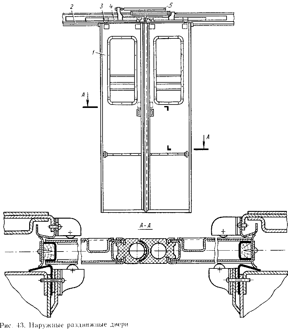 Наружные раздвижные двери состоят из двух алюминиевых створок / (рис. 43), подвешенных на кронштейнах 4 к рейке 3.