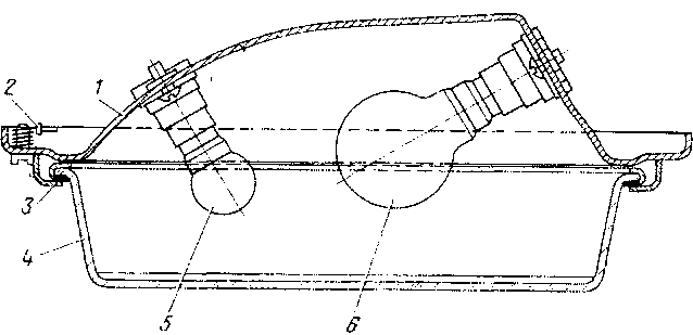 / — корпус светильника; 2— замок; 3 — резиновая прокладка; 4 — стекло; о-- лампа дежурного освещения; в — лампа общего освещения