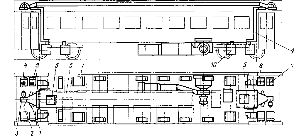 к вертикальным стойкам каркаса. На торцовых стенах по обе стороны средней двери перегородками образованы шкафы для размещения электрической и пневматической аппаратуры. Концевые стены без шкафов имеют обшивку без отепления.