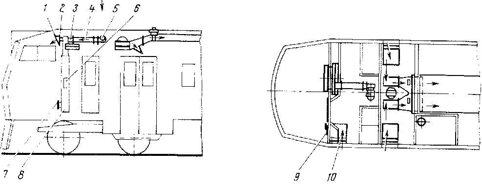 Наружный воздух засасывается через жалюзи 4, расположенные над входными дверями. Затем воздух через фильтры поступает в чердачное помещение, а оттуда через дроссель-клапан нагнетается вентилятором в потолочный вентиляционный канал, из которого через отверстия в листах канала поступает в пассажирское помещение.