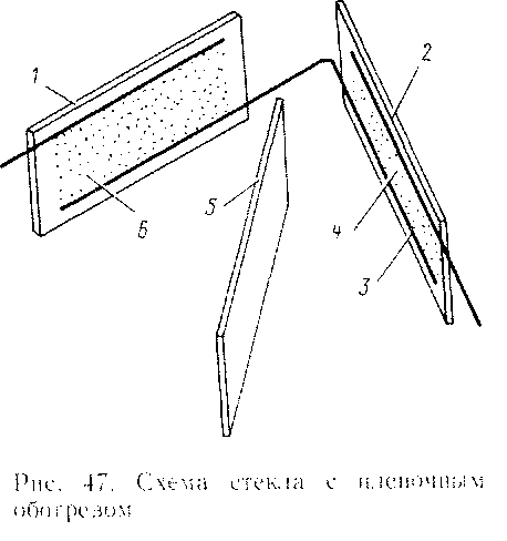 Для предотвращения обледенения и запотевания применен пленочный электрообогрев стекол кабины машиниста. Стекла окон имеют неразборную конструкцию силикатного электрообогревного триплекса, запрессованного в металлические рамки (рис. 47). Они состоят из внешней / и внутренней 2 закаленных силикатных пластин, склеенных прозрачной эластичной прокладкой 5. Такая трехслойная конструкция обеспечивает безосколочное разрушение стекол при \ дарах и механических повреждениях. На внутренние поверхности внешней / п внутренней 2 пластин нанесено прозрачное токопроводящее покрытие 4, 6, ограниченное токоведущими серебряными шинами 3. Токоведущие шины выведены на клеммы штепсельного разъема. Питание нагревательных элементов осуществляется от сети постоянного тока напряжением 110 В. В зависимости от температуры наружного воздуха предусмотрено 4 режима обогрева стекол. Нужный режим обеспечивается различным соединением между собой нагревательных элементов внутренней и внешней пластин.