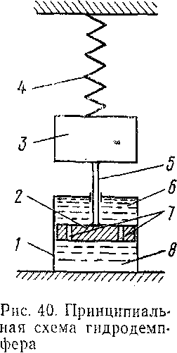 Гидродемпферы служат для снижения амплитуд колебания (см. § 3) локомотива при скоростях движения, близких к резонансной, и ограничения их при резонансе. Принципиально работу гидродемпфера, можно проследить по схеме рис. 40. Собственно демпфер состоит из наполненного вязкой жидкостью цилиндра 1 (рис. 40), в котором движется поршень 2, снабженный отверстиями 7. Поршень штоком 5 соединен с телом 3, обладающим некоторой массой. Последняя подвешена на пружине 4.