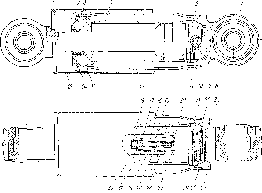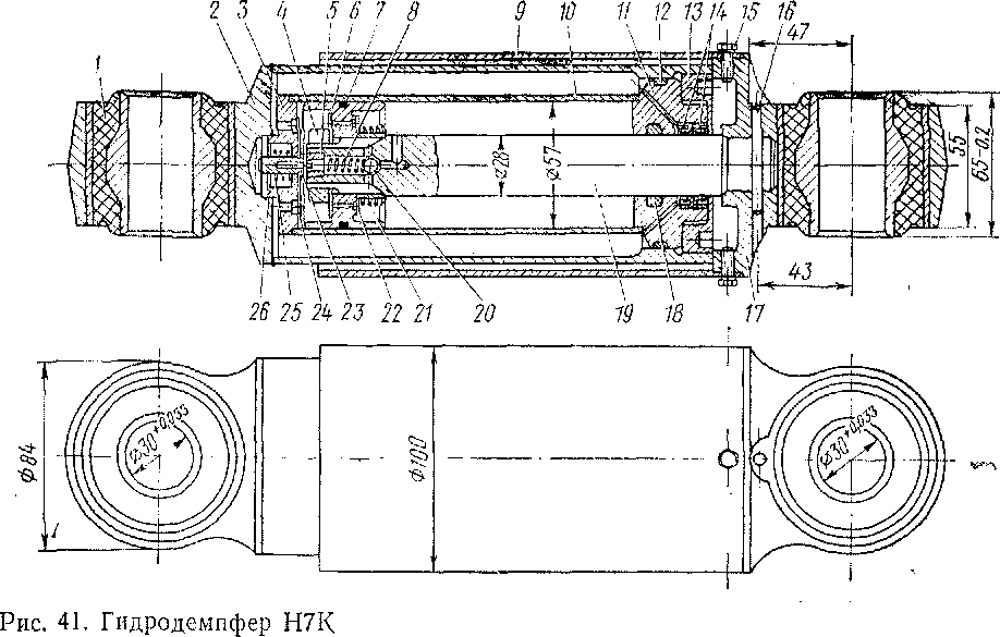 Говоря о вертикальном перемещении колеса на короткой неровности, следует иметь в виду подъем колеса, так как «просадка» его на такой неровности по конструкции рельсового пути при существующих диаметрах колес практически невозможна. Таким образом, при выбранном в рассматриваемом экипаже способе установки гидродемпфера нежелательный режим работы осуществляется при перемещении поршня вниз (при сжатии гидродемпфера). Для устранения этого недостатка установленные на электровозе ЧС4 гидродемпферы Н7К имеют ряд устройств, назначение которых становится ясным при рассмотрении конструкции гидродемпфера (рис.41).