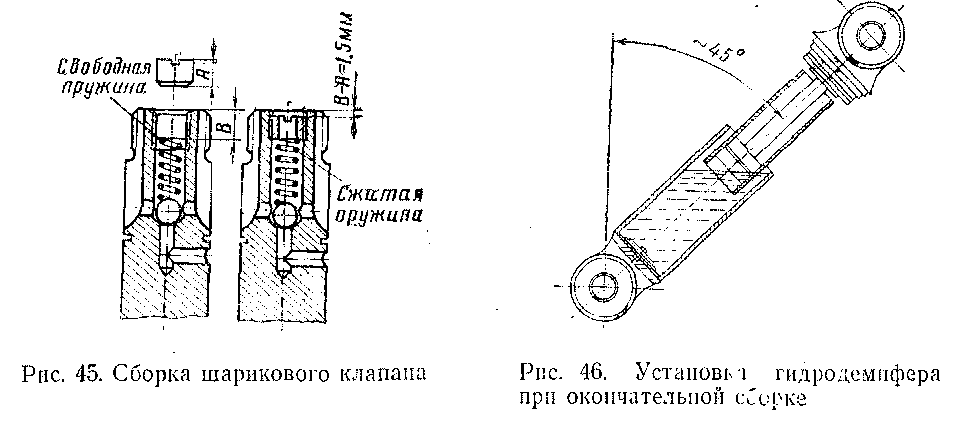 Сборка гидродемпфера производится в обратном порядке. Перед монтажом детали тщательно промываются бензином и продуваются воздухом. Масло (АЩ}10; ГОСТ 6794—53) в количестве 650 см3 заливают в цилиндр после фиксации его в дне. При введении в цилиндр, заполненный маслом, штока с поршнем необходимо исключить образование воздушной подушки.