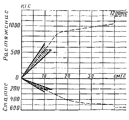 На электровозах, начиная с ЧС4-212, установлен гидродемпфер TBS (рис. 47). Его габаритные размеры и характеристика (рис. 48) обеспечивают взаимозаменяемость с гидродемпфером Н7К. В отличие от последнего гидродемпфер TBS имеет ограничение максимальной демпфирующей силы как в зоне сжатия, так и в зоне растяжения. Кроме того, при скоростях перемещения поршня больше 15 см/с силы растут незначительно (слабо прогрессирующая характеристика). Наибольшая скорость поршня, практически реализуемая при движении электровозов, равна 23 см/с, что для гидродемпфера Н7К соответствует силе 1300 кгс, а для гидродемпфера TBS—950 кгс. При этом энергоемкость обоих гидродемпферов практически одинакова.