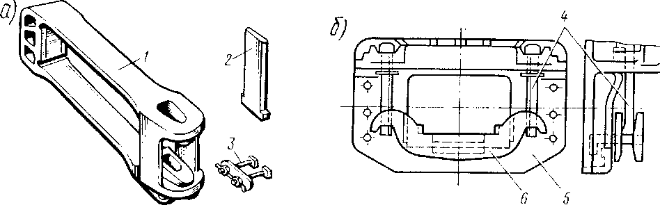 Тяговый хомут / (рис. 51, а) представляет собой стальную отливку, состоящую из двух горизонтальных полос, соединенных по концам вертикальными связями. Передняя часть хомута имеет окно для прохода хвостовика автосцепки и отверстия для клина. В верхней части хомута под отверстием для клина есть два ушка с отверстиями для постановки болтов 3 с планкой, служащих опорой клину. Клин 2, соединяющий хвостовик автосцепки с тяговым хомутом, ставят снизу. От подъема вверх клин удерживается заплечиками. Изготавливают его штамповкой из Ст5.