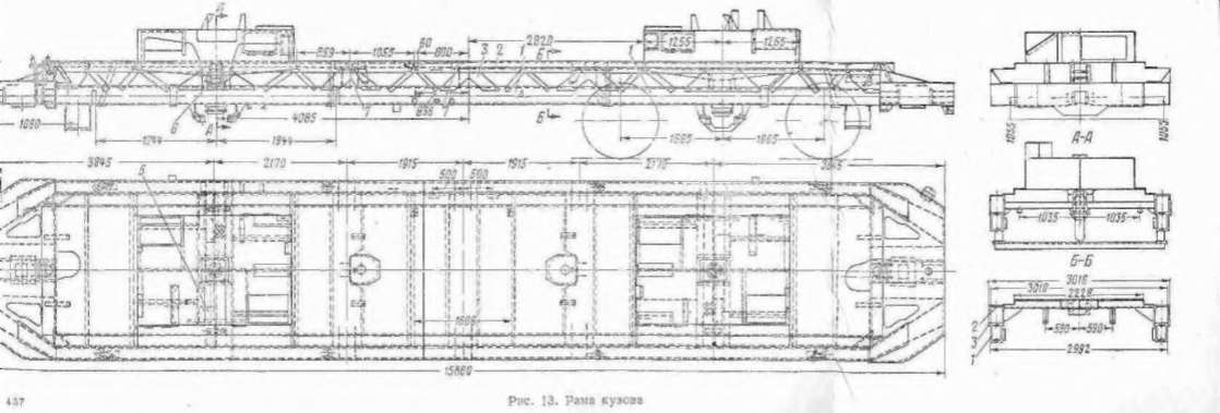 Перечним балкам рами крепятся цилиндры протиноразгрузоч-ноги JMI'pChtctU. К продольным балкам кренится ряд более мелких поперечных соединений, являющихся каркаом для пяльиых ли стон, закрывающих раму сверху. Около шкворневой балки настил пола подин і на .'іОО мм для удобного размещения тяговых диига телеп. Па продольных балках протни шкворневых балок имеїоіся опоры, которыми кузон ИНГрЯЯТЕЯ М тележки. L боковых сторон к раме при порицаете я по два кропііітеіїна с каждой стороны для захвата кузова при подъеме мостовым краном.