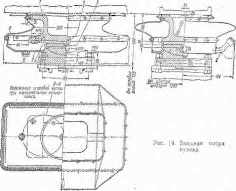 Каждая боковая опора (рис. 14) состоит из литого стального основании /, припариваемою к боковой продольной балке главной рамы Кузова. К основанию крепится болтами Mill с потайными го-лонкамн стальной верхний скользун (і размером 160x 280 ««.