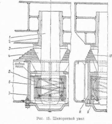 Применение шарового вкладыша обеспечивает работу шкворня без заеданий при наклонах кузова относительно тележки. Гнездо шара удерживается в коробке нижней крышкой 9, являющейся одновременно дном масляной камеры, образуемой стенками коробки 7. Работа шарового вкладыша и гнезда шара э масле значительно снижает износ деталей. Между верхней частью коробки 7 и фланцем шкворня устанавливается кожаный чехол 10, предохраняющий шкворневой з-зел от попадания пыли и грязи в масло и на трущиеся детали.