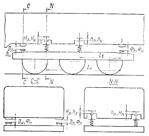При монтаже системы рессорного подвешивания после указанного вида ремонта необходимо следить за тем, чтобы каждая тележка и опоры кузова, приходящиеся на одну тележку, комплектовались пружинами одной группы (см. § 5).