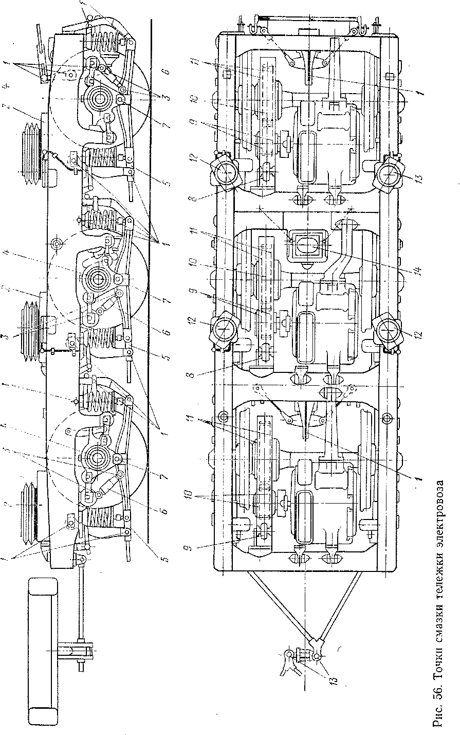 На величину зазоров, а следовательно, и на развеску (при сохранении положения регулировочных болтов и гаек) в эксплуатации могут повлиять: неравномерный прокат колес; потеря упругих характеристик элементами рессорного подвешивания (просадка пружин); излом пружин-; излом или повреждение элементов рессорного подвешивания, влияющих на величину сжатия пружин под нагрузкой (излом регулировочного болта, заедание стакана опоры кузова в направляющей втулке и т. п.). Кроме того, нарушение развески может быть следствием неравномерной загрузки песка по бункерам и отсутствия смазки. Поэтому перед постановкой локомотива под обмер рекомендуется полностью высыпать песок из бункеров либо заполнить их до верхних контрольных отметок, а также смазать все узлы трения (рис. 56). Первый вариант является более предпочтительным, так как в прото-