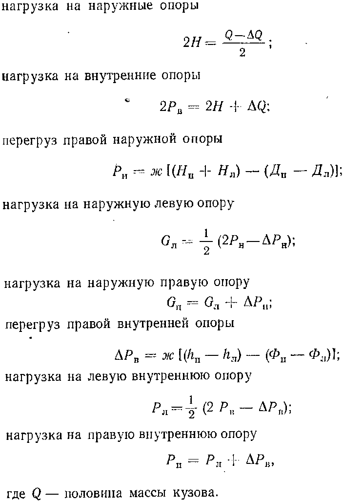 В действительной конструкции центры тяжестей не совмещены с указанными точками. Прежде всего это относится к подрессоренным массам тележки. Поэтому на выкаченную из-под кузова тележку в продольном и поперечном направлениях действуют моменты сил, равные произведению веса обрессоренных элементов на соответствующий эксцентриситет центра тяжести. Эти моменты уравновешиваются реакциями в рессорном подвешивании, в результате чего упругие элементы деформируются на разную величину (передают различные по величине нагрузки), и рама тележки устанавливается с перекосом. Для того чтобы под нагрузкой кузова рама тележки выровнялась (приняла строго горизонтальное положение), а следовательно, выровнялись бы нагрузки на буксы, силы на опорах кузова должны быть различными по величине. Моменты, действующие на раму тележки в продольном и поперечном направлении, составляют соответственно 6880 и 1090 кгс/м.