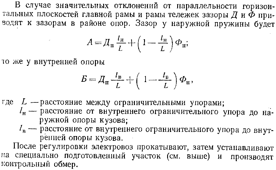 Наиболее сложной является регулировка, которая производится после ремонтных работ, связанных со сменой агрегатов и разборкой экипаж* (элементов рессорного подвешивания), т. е. в тех случаях, когда могут быть изменены положения центров тяжестей тележек и кузова. В данном случае материалы, приведенные в протоколе испытаний, могут использоваться только как ориентировочные, так как зазоры, полученные при заводской регулировке, теперь могут не соответствовать оптимальному распределению веса локомотива по колесам.