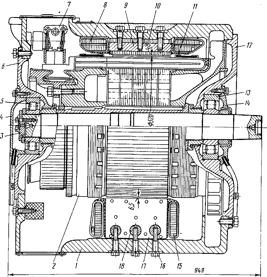 / —остов; 2 —якорь; 3 —шайба упорная; 4 — передняя крышка. 5 —радиально-упорный роликоподшипник; в — передний подшипниковый шит; 7—щеткодержатель; 8 —катушка главного полюса; 9—стержень главного полюса; 10—сердечник главного полюса; // — пружинный фланец; 12 — задний подшипниковый шит; 13 — радиальный роликоподшипник; 14 — задняя крышка; 15—катушка дополнительного полюса; 16— полюсный болт; 17 — сердечник дополнительного полюса; 18 — стержень дополнительного полюса