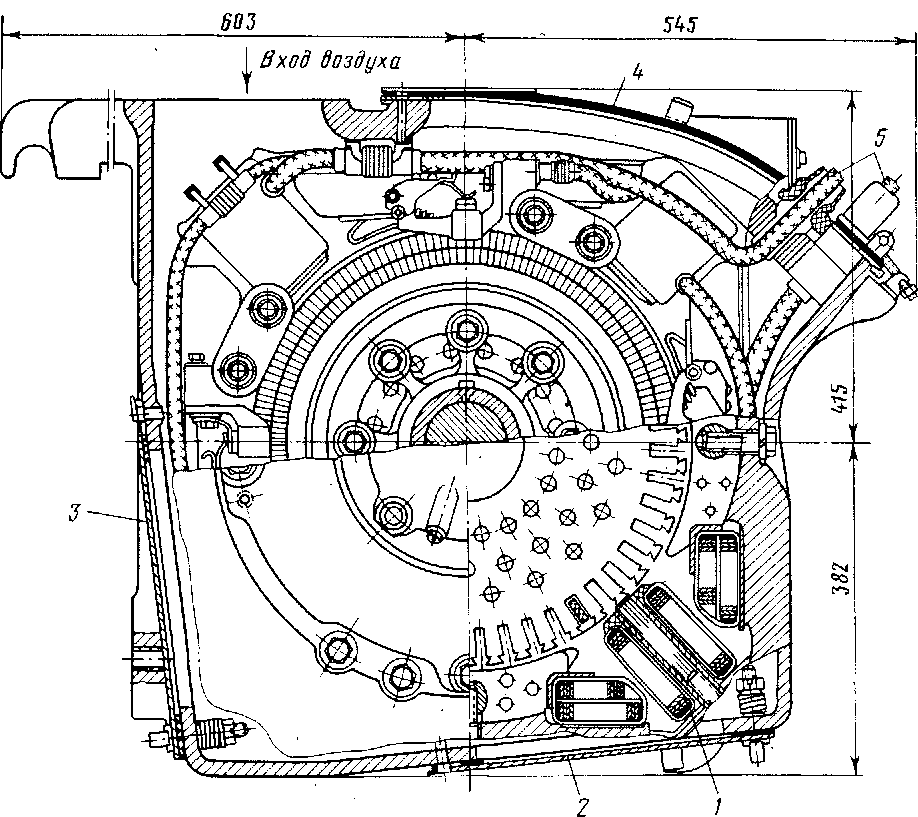 Вентилируемый воздух, поступающий в двигатель через патрубок, проходит внутрь двумя параллельными потоками. Один поток охлаждает внешнюю поверх-