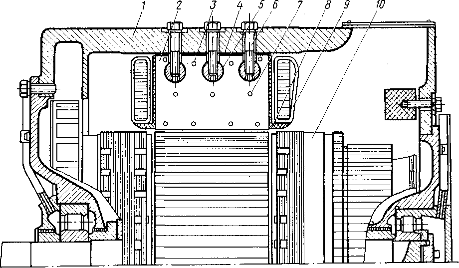 Рис. 64. Тяговый двигатель РТ-51М с шихтованным сердечником дополнительного полюса: /-остов тягового двигателя; 2 - стальные листы сердечника; 3. 7 - заклепки; ./-прокладка; 5 - стержень; 6 - болт; 8 — фланец; 9 — катушка дополнительного полюса; 10 — якорь двигателя