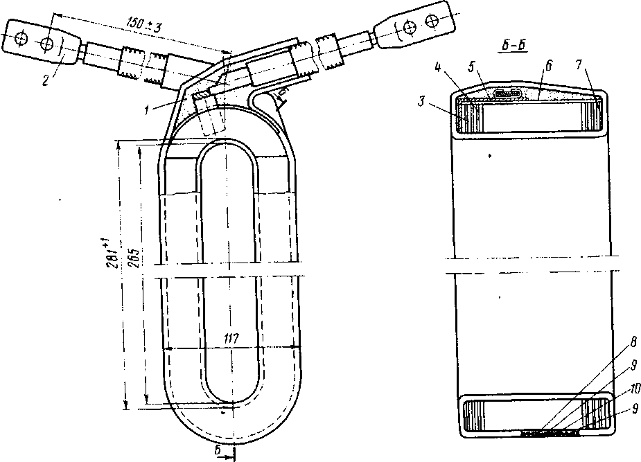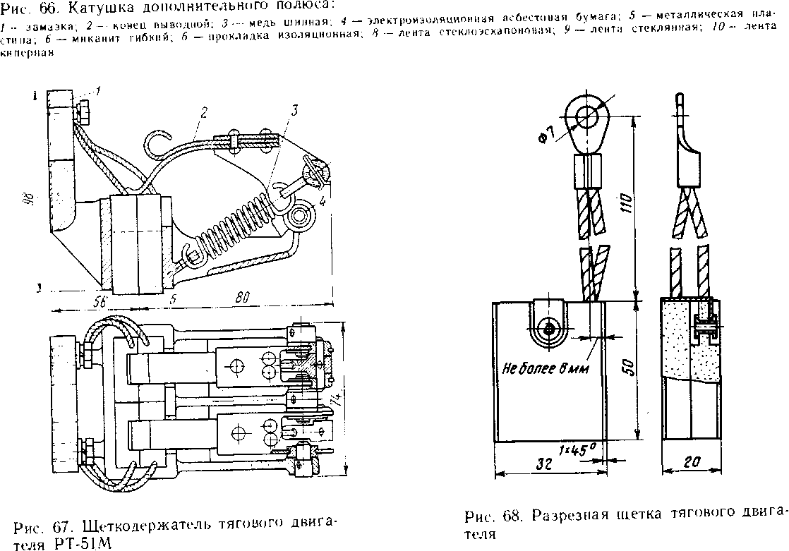 Катушки дополнительных полюсов (рис. 66) намотаны на ребро из шинной меди МГМ 3,05X26,3 мм и имеют по 37 витков. Они изолированы от корпуса шестью слоями стеклослюдинитовой ленты толщиной 0,11 мм и двумя слоями стеклоленты. Междувитковая изоляция обеих катушек выполнена из асбестовой бумаги 4 толщиной 0,3 мм. Все ленты укладываются на катушках в полупере-крышу. Внутренние пустоты катушек заполняются специальной замазкой /. После изолирования катушек для придания им монолитности и создания лучшего теплообмена их подвергают пропитке в компаунде № 225Д с последующим покрытием изоляционным лаком БТ-99. Класс изоляции катушки В. Готовые катушки испытывают на отсутствие междувитковых замыканий импульсным напряжением 250 В на виток. Испытательное напряжение для обмотки статора тягового двигателя РТ-51Д равно 5500 В (частотой 50 Гц) в течение 1 мин.