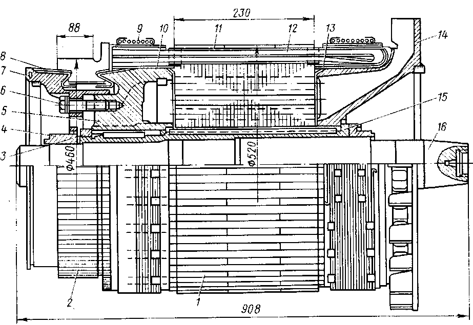 / _ сердечник якоря; 2 — коллектор; 3 — гайка; 4 — передняя лабиринтная втулка; 5 — втулка коллектора; 6 — коллекторный болт; 7 — нажимной конус; 8 — миканитовые манжеты; 9 — бандаж; 10 — миканитовые полуцилиндры; // — клин; 12 — секция обмотки якоря; 13— миканит; 14 — обмоткодержатель; 15 — втулка якоря; 16 — вал якоря