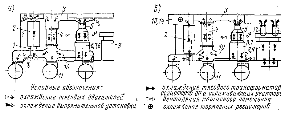 Для охлаждения тягового оборудования воздух засасывается из отсеков, расположенных над машинным помещением. Через радиаторы 8 масляного охлаждения тягового трансформатора 9 воздух прогоняется двумя осевыми вентиляторами 12, номинальной' производительностью по 2 м3/с каждый. Охлаждение резисторов 6 ослабления поля тяговых двигателей и сглаживающих реакторов 7 осуществляется осевым вентилятором 5 номинальной производительностью 6,5 м3/с. Охлаждение тяговых двигателей 11 и полупроводниковых преобразовательных установок 2 — общим осевым вентилятором 4 повышенной производительностью 8 м3/с. Нагретый воздух в основном выходит под кузов электровоза, а из полупроводниковых преобразовательных установок (куда он отводится из распределительных каналов 10) воздух выбрасывается в отсек с тормозными резисторами. Как и