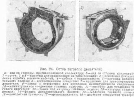 В остове тягового двигателя (рис. 24) размещены главные и дополнительные полюсы с катушками, межкатушечные соединения