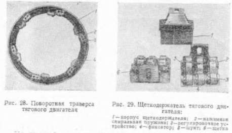 Щеточный аппарат. Для удобства обслуживания и монтажа щеточного аппарата щеткодержатели с кронштейнами смонтированы на поворотной траверсе 16 {см. рис. 24), размещенной в остове тягового двигателя над коллектором. Перемещениетразерсы осуществляется специальным ключом, который надевается на ось шестерни 18. При повороте ключа поворачивается шестерня, входящая в зацепление с внешним зубчатым венцом траверсы 16. Предварительно необходимо от двух верхних кронштейнов щеткодержателей отсоединить кабели, идущие к катушкам полюсоз. При этом можно осмотреть все щеткодержатели тягового двигателя через верхний люк.