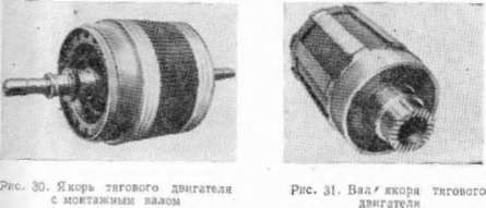 Якорь. Якорь тягового двигателя (рис. 30) состоит из полого вала, сердечника с обметкой, двух нажимных шайб и коллектора .(вал. изображенный на рис. 30, является вспомогательным и применяется только в проаессе изготовления).