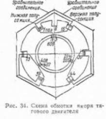 Обмотка якоря тягового двигателя имеет шаг по пазам 14 э/4 и по коллектору 1-2, т. е. к первой коллекторной пластине присоединены первая шина нижней полусекции из первого
