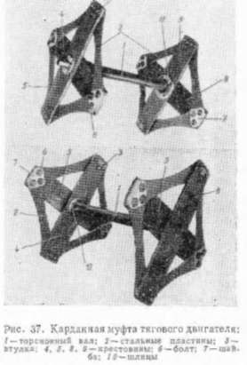 Карданная муфта. Момент вращения якоря тягового двигателя передается при помощи торсионного вала и двух пластинчатых муфт (рис. 37) на малую шестерню и через венец зубчатого колеса на колесную пару.
