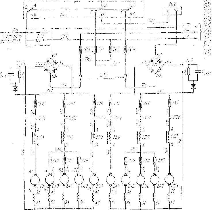 Конструктивно каждые три моста объединены в одну выпрямительную установду. Электродвигатели 239, 244 вентиляторов тяговых двигателей и выпрямительных установок и электродвигатели 243, 248 компрессоров получают питание через отдельные выпрямительные мосты 2201? 2203, 2204, 220в. К выпрямительным мостам 220% и 2205