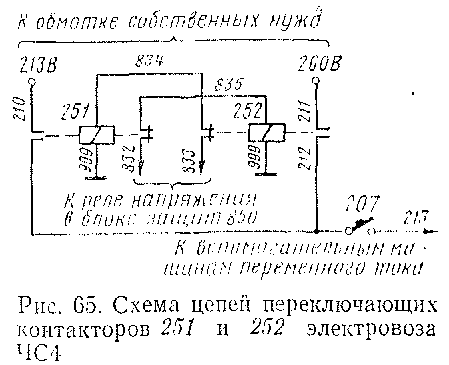 Как отмечено выше, напряжение во вспомогательных цепях""переменного тока на электровозах ЧС4 регулируется ступенями в зависимости от величины напряжения в контактной сети. Питающий провод 213'подключается к обмотке собственных нужд 015t силовыми контактами контакторов 251 или 252 и АЗВ 207. Исключение составляет зарядное устройство аккумуляторной батареи (блок 271), напряжение на входе которого не регулируется (начиная с электровоза ЧС4-062).