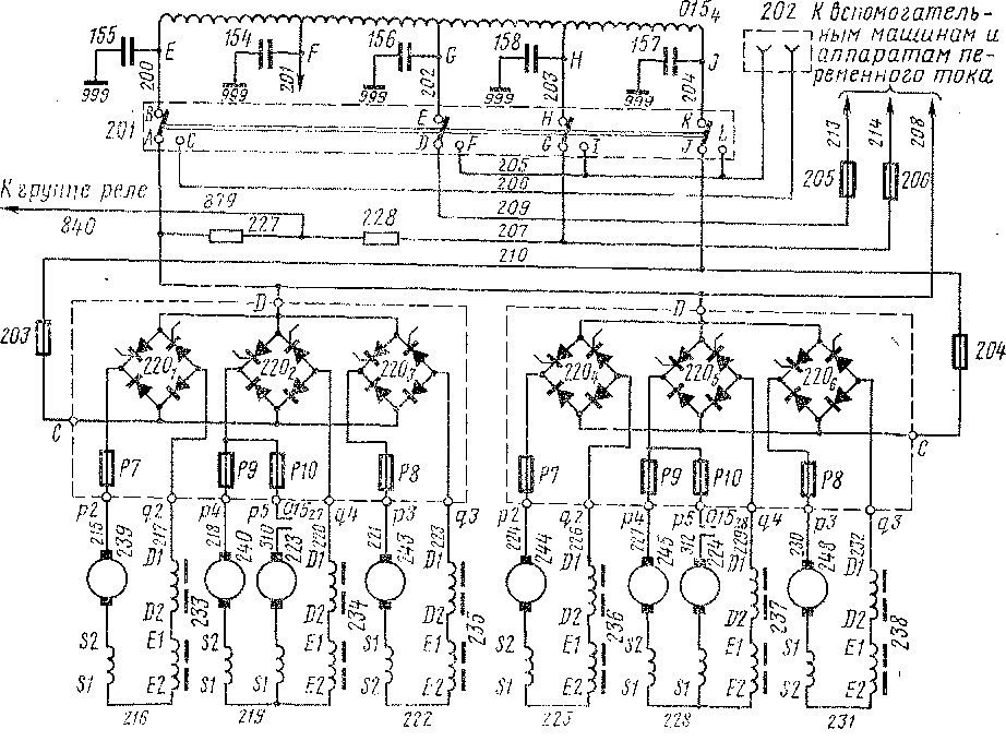 В цепях вспомогательных машин электровозов ЧС4' также использованы защитные устройства с той разницей, что количество групп демпфирующих конденсаторов увеличено до пяти и обозначены они номерами 154—158 (рис. 66). Для привода главных компрессоров и вентиляторов на этих электровозах, как и на электровозах ЧС4, использованы электродвигатели постоянного тока, но питание их производится стабилизированным напряжением. Стабилизация осуществляется путем фазового регулирования выпрямленного напряжения. На коллекторы вспомогательных электродвигателей питание приходит с выводов Е — / обмотки собственных нужд тягового трансформатора (номинальное напряжение 354 В) через контакты А — В и •/ — К "четырехполюсного рубильника на панели 201 и полууправляемые параллельно включенные мосты 220г — 2206.