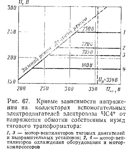 В случае снижения напряжения частота вращения и мощность па валах электродвигателе]"! постоянного тока уменьшатся, из-за чего производительность вспомогательных машин может оказаться ниже требуемой. Еще более опасно снижение напряжения для электродвигателей переменного тока, у которых может наступить опрокидывание или оказаться невозможным пуск этих машин. Поэтому в целях улучшения режимов работы вспомогательных машин на электровозах ЧС4 и ЧС41 регулируют напряжение питания.