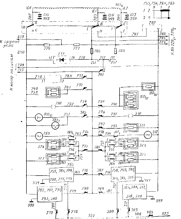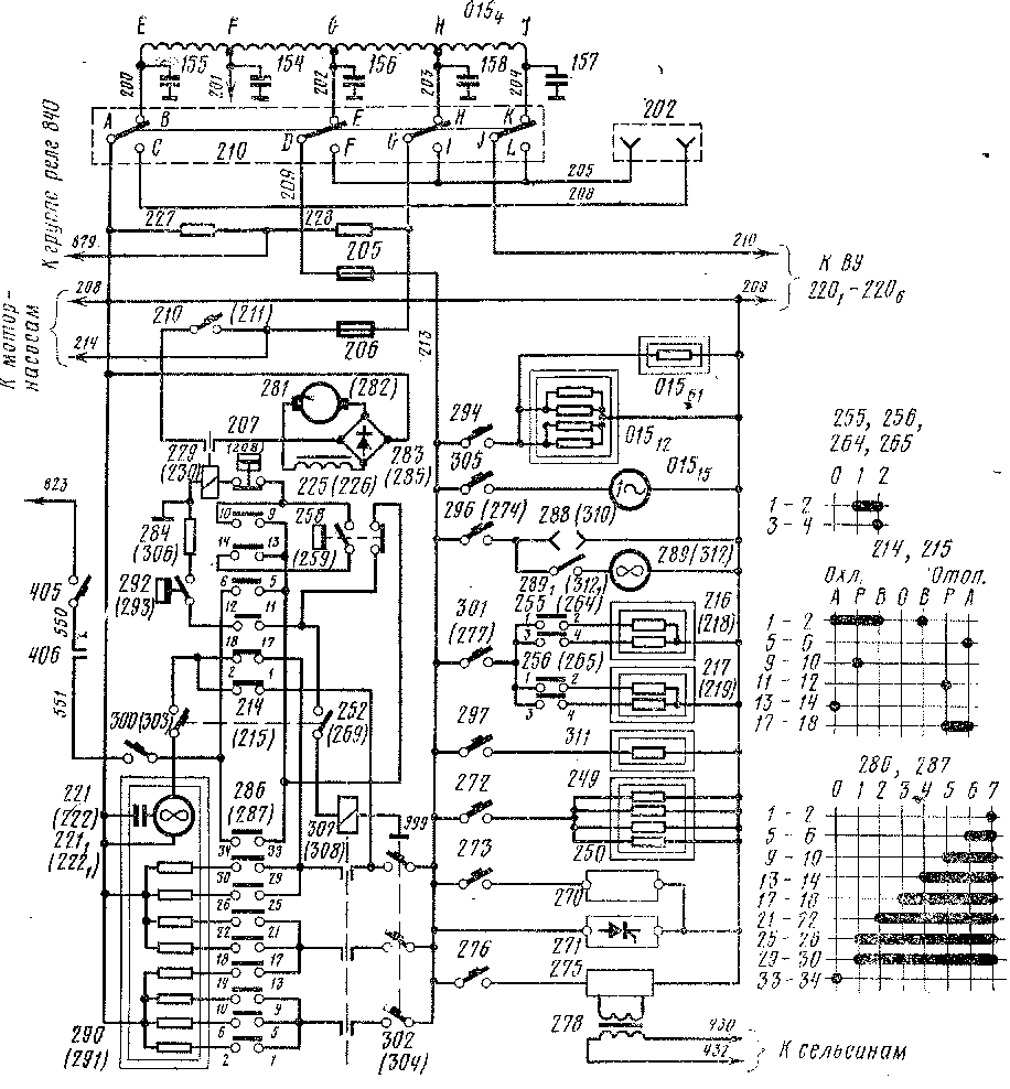 ных реле 253 (254). Кнопкой 257 можно проверить правильность работы контакторов 262, 264 и 265, а также восстановить цепь питания электродвигателей при переключении напряжения контакторами 251, 252.