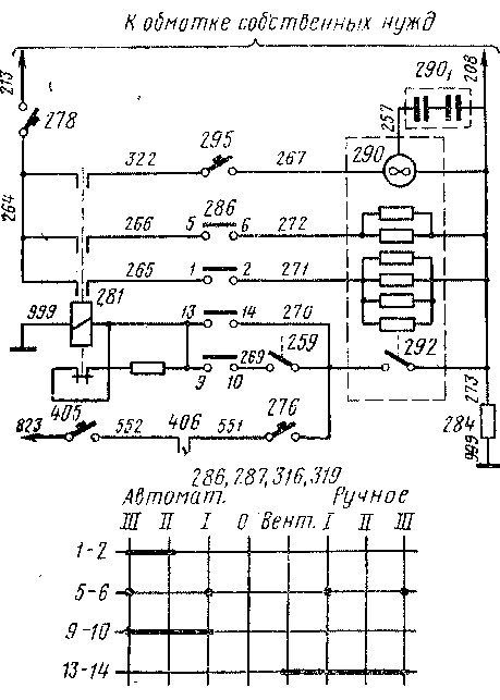 При постановке режимного переключателя 214 (215) в положение В (вентиляция) на электродвигатель вентилятора 221 (222) подается переменное напряжение через АЗВ 302 (304), контакты 1—2 режимного переключателя и АЗВ 252 (269).