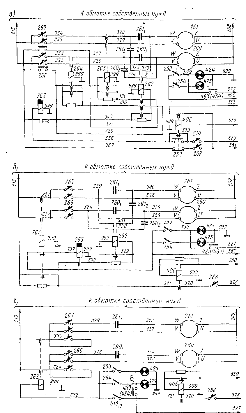Пуск насосов (рис. 71, а) при замкнутых переключателях 266, 267 происходит автоматически после включения ГВ. Получив питание, контактор 406 срабатывает и подает напряжение на катушку контактора 262, который подключает параллельно рабочим конденсаторам 260г и 261г электродвигателей масляных насосов пусковые конденсаторы 2602 и 2612. Одновременно другие замыкающие контакты контактора 262 включают контакторы 264 и 265. Последние присоединяют электродвигатели масляных насосов к обмотке собственных нужд тягового трансформатора 015^ через силовые контакты одного из контакторов 251 или 252.