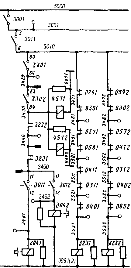 Шаговое реле включается и становится на самопитание по цепи: контакты 5 — 6 ВУ 301, провод ЗОЮ, прямые блок-контакты 8 — 1 реле 322, провод 306, далее по двум цепям.