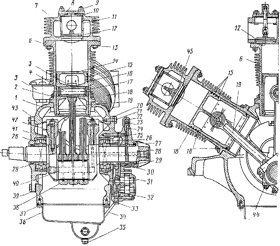 К цилиндрам болтами 13 прикреплены чугунные головки 7. Цилиндры и головки имеют ребра, улучшающие отвод тепла от стенок окружающим воздухом. В головках размещены нагнетательные 12 и всасывающие 45 клапаны, стаканы 11 и тарельчатые пружины 10. Головки закрыты крышками 8, которые удерживаются гайками 9, навернутыми на шпильки. В каждом цилиндре находятся по два клапана: один всасывающий и один нагнетательный.
