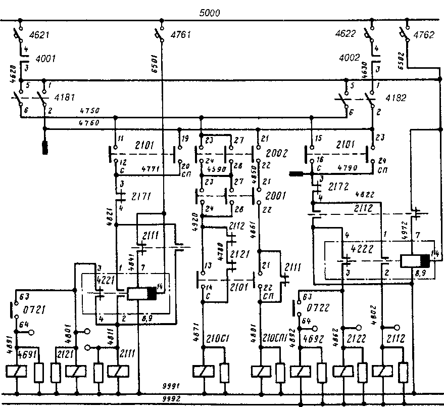 При постановке переключателя 4181 в положение "ВС" создается цепь питания катушки электропневматического вентиля СП переключателя 2101: провод 5000, АЗВ 4621, контакты 4 — 3 контактора 4001, провод 4620, контакты / — 2 выключателя 4181, замкнутые в положении "ВС", провод 4760, контакты 21 — 22 отключателей 2002 и 2001, замкнутые при положении "НЭ", провод 4861, обратные блок-контакты контактора 2111, провод 4881, катушка вентиля СП переключателя 2/01, провод 9991. После перевода переключателя 2101 в положение "СП" замыкаются его блок-контакты 21 — 22 между проводами 4861 и 4881, и катушка вентиля СП становится на самопитание.